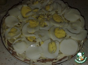 Яйца режем кружочками и выкладываем третий слой. По желанию один желток оставляем для украшения. Смазываем майонезом.