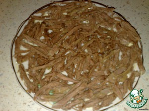 Для начала отвариваем мясо, остужаем, режем соломкой и выкладываем первый слой. Поливаем майонезом.