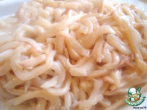 Кальмары порезать тонкими полосками.