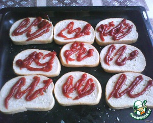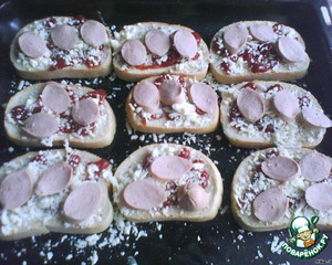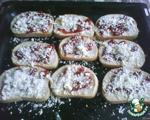 Заготовка бутербродов готова. Ставим в духовку на 10 минут. Сыр должен растаять, а батон слегка поджариться.