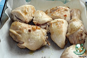 Курицу разделать на порционные куски. Натереть солью и перцем. Обжарить на сливочном масле с двух сторон. Огнеупорную форму застелить пекарской бумагой. Выложить куски курицы.