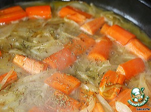 Посыпать мукой, хорошо перемешать, влить бульон, добавить тимьян и тушить 5 минут.