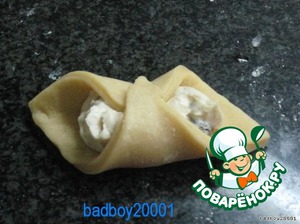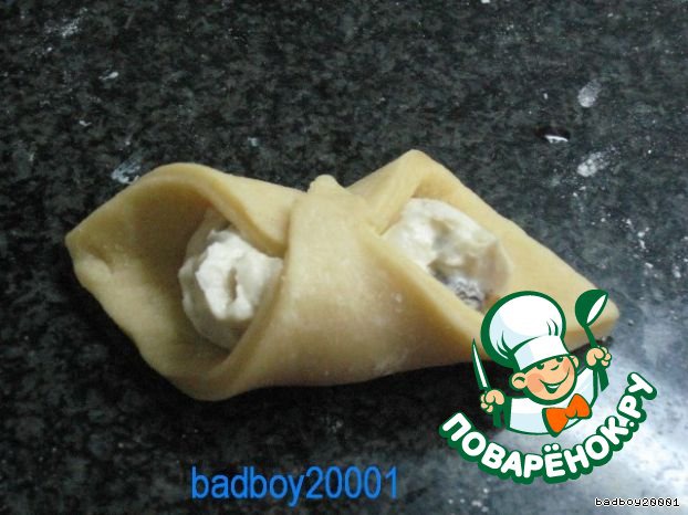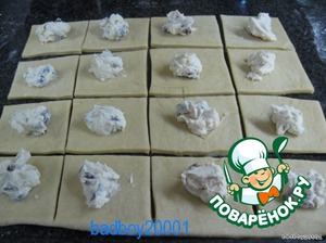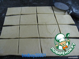 Тесто раскатать толщиной 3-4 мм и разрезать на квадраты