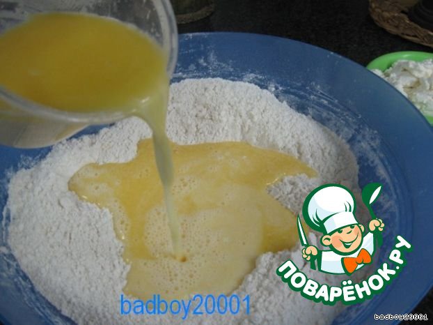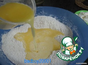 Масло и молоко разогреть в микроволновке, добавить желтки в муку