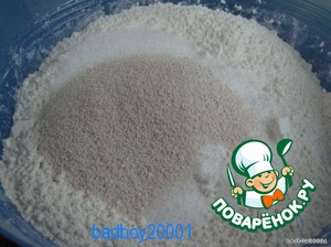 Муку просеять, посолить и перемешать, добавить сахар и дрожжи