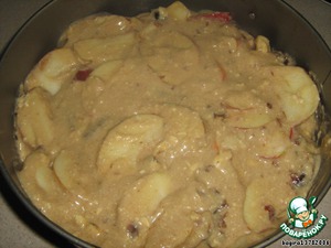 Масса получается довольно плотная и размешать ее тяжело. Поэтому в тесто выливаем воду, в которой находились финики и яблоки.