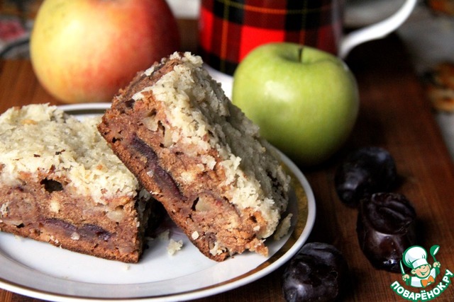Затем в тесто кладем финики с яблоками и все хорошо перемешиваем.