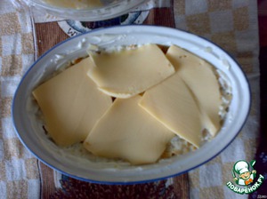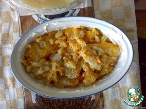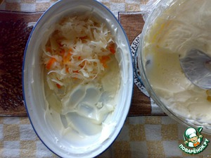 После того как капуста отварена, а рыба пожарена, в форму для запекания в духовке, предварительно смазанную майонезом (лучше всего домашнего приготовления), выкладываем капусту.
