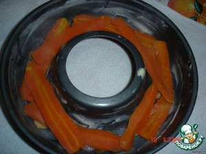 Для запекания я использовала кольцеобразную форму,но можно взять любую. Все ингредиенты я подготовила предварительно: грибы слегка обжарила, морковь приварила, перец запекла, лук спacсеровала и добавила шпинат. Форму внутри смазала маслом, на дно уложила дольки шампиньонов и креветки,