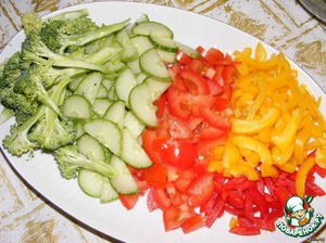 Режем помидор, перец и огурец, брокколи разбираем на соцветия.