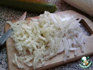 Также соломкой режем огурец. Я болгарский перец не ем, поэтому не добавляю, а вы про него не забудьте, т.к. изначально он был в рецепте. Можно взять зеленый, в тон, или красный для контраста.