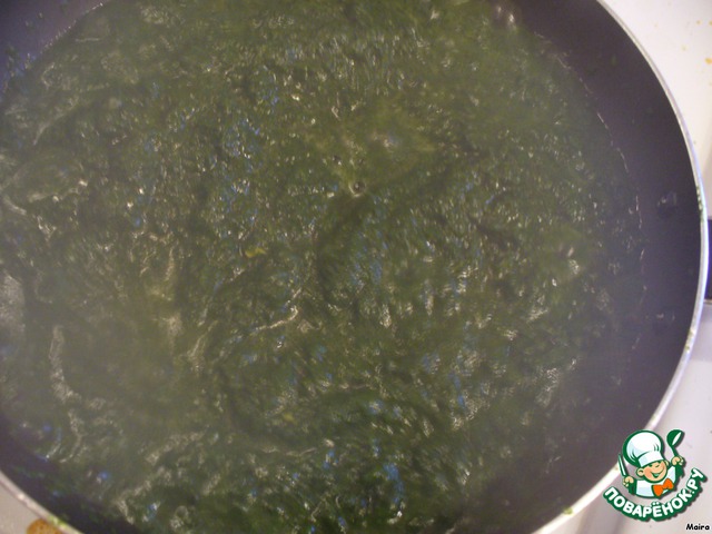 Шпинат, не размораживая, обжарить на растительном масле 10 минут (пока не выпарится вся жидкость), посолить. Сыр натереть на крупной терке. |