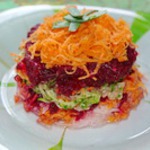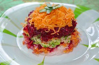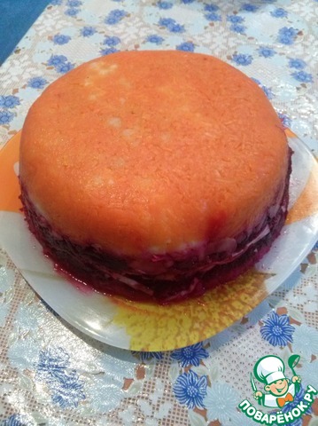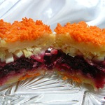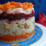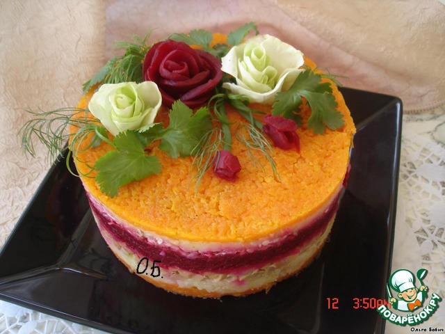 Вкусно! Буду использовать этот салат на праздники - смотрится эффектно, разбавит мясные закуски и майонезные салаты, да и сделать можно за день до торжества, т. к. он прекрасно держит форму. Делала и с грибами и с селедкой. Единственное, на мой вкус, нужно картошку/маркошку посолить после натирания. Заправку взбила блендором и получился горчичный соус - очень вкусно с хлебушком и другими салатами. К сожалению, цветочки у меня не получились и я украсила салат мелко нарезанным зеленым луком - выложила его полосочками на морковку. Смотрелось очень неплохо, да и по вкусу он был уместен. Спасибо за рецепт.