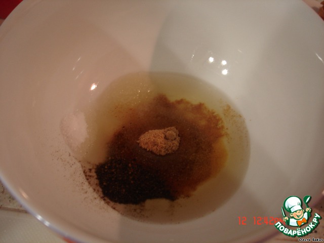 • Приготовим соус: смешать горчицу, сахар, масло, уксус, добавить соль, черный перец и сухой чеснок по вкусу, хорошо перемешать.