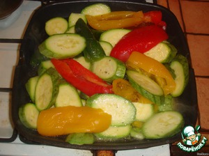 • 1.Овощи нарезать. Перцы - вдоль на четыре части, кабачки - продолговатыми кругами.