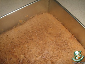 На дно формы, в которой уже застыла карамель, кладем бисквитную смесь, которая должна занимать около 1/4 формы, т. к. бисквит поднимется.