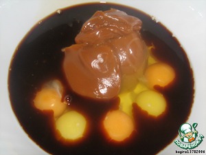 Теперь в масляно-яичную смесь вводим теплый кофе.