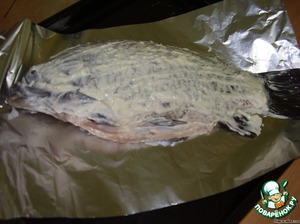Теперь заворачиваем фольгу таким образом, чтобы получилось что-то наподобие корытца. Так ничего не вытечет и верхушка рыбки немного запечется. Отправляем карпика в предварительно разогретую духовку примерно на 1 час.