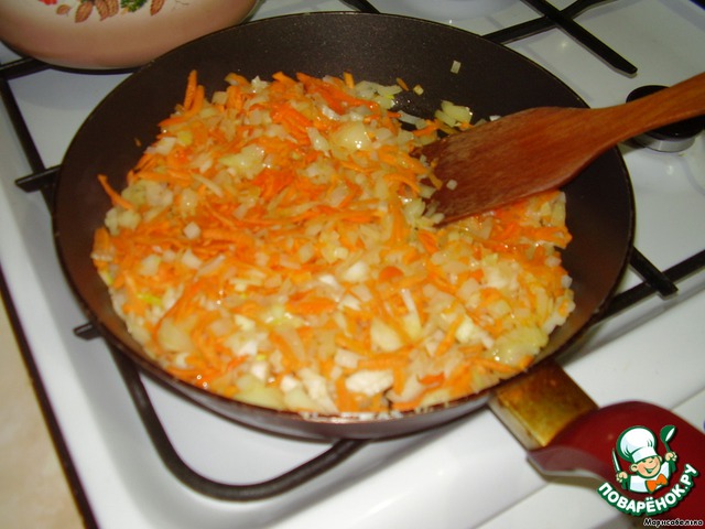 Теперь лук и морковь обжариваем до золотистого цвета, в процессе перчим.