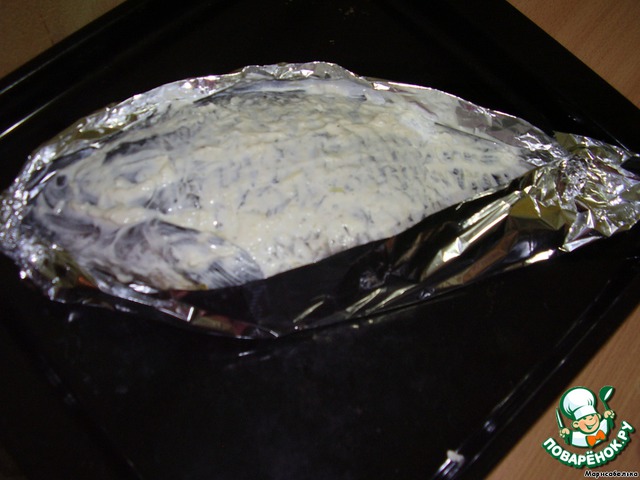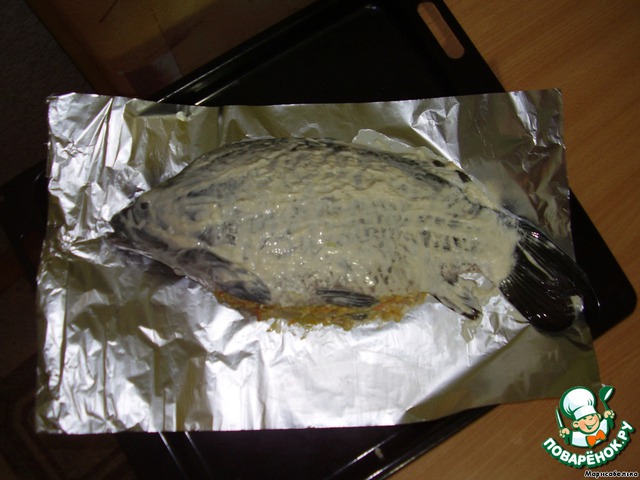 Берем нашего карпа, обмазываем его солью, затем майонезом и выкладываем на противень, предварительно застеленный фольгой (но это не обязательно, можно просто на противень).