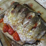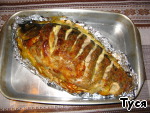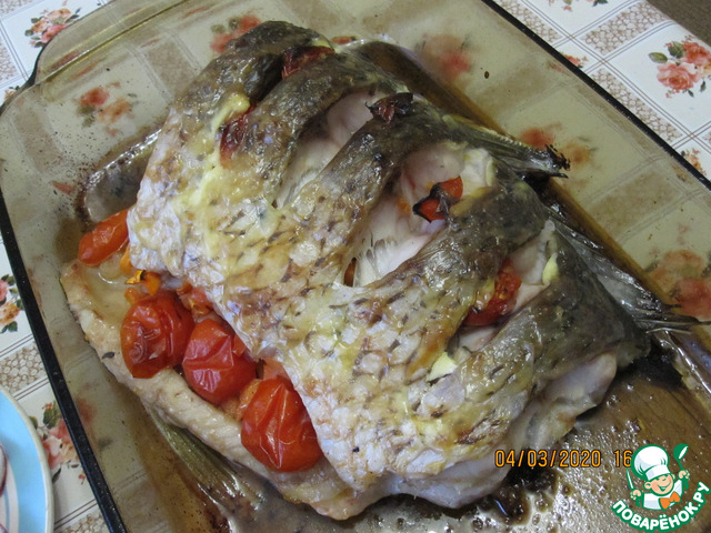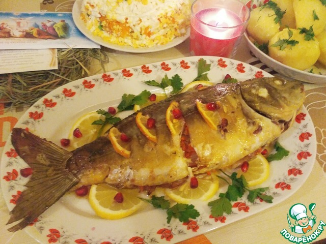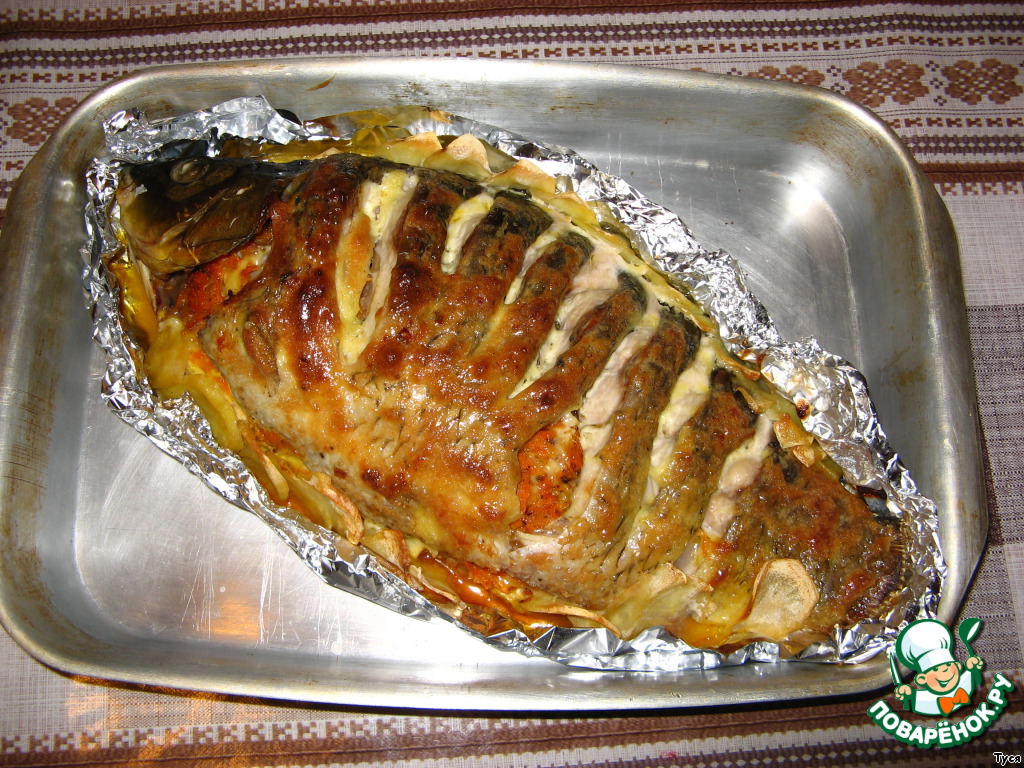 Нежный карп, фаршированный луком и морковочкой с чесночком.