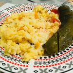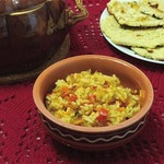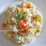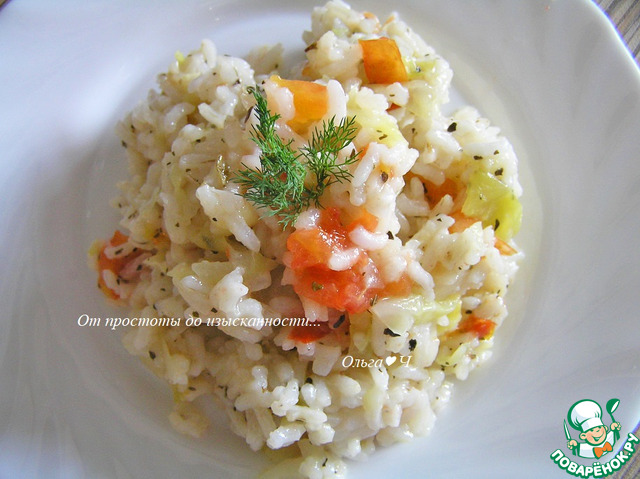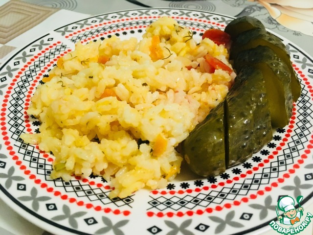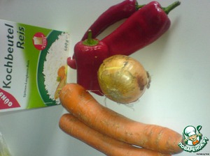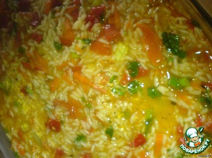 Я люблю готовить плов в духовке. Поэтому наши обжаренные овощи я переложила в чугунок /у меня чугунок стеклянный, как раз только для духовки, но не для печки/ сверху высыпала рис и залила кипящей водой.