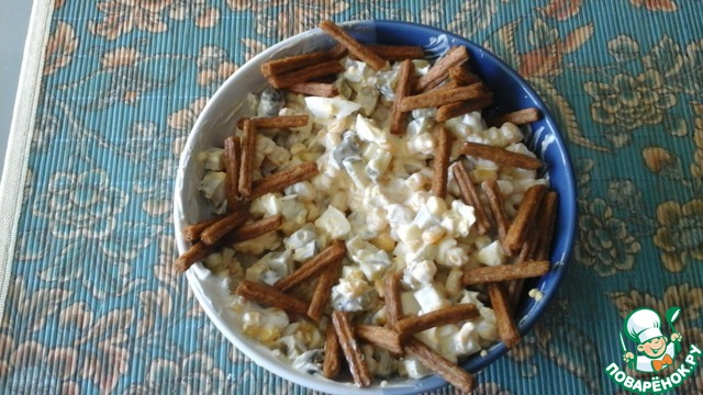 Все - колбасу, яйца, огурцы, сыр, сухарики и кукурузу смешать и добавить майонез по вкусу. Если необходимо, добавить перец и соль - я не клала - сыр и огурцы сделали свое "соленое дело".