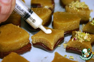 Итак, конфетки достаем из холодильника, переворачиваем шоколадной стороной вниз, на каждую выдавливаем капельку белого шоколада и посыпаем порубленными фисташкашками.