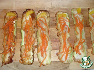 • Выкладываем обжаренные кабачки в ряд и начинаем колдовать:-). Намазываем кабачки толченым чесноком, на один край кладем ломтик болгарского перца (можно и помидорку, но не оказалось), и по всей длине корейскую морковь. И, начиная от края с перчиком, начинаем сворачивать. Когда свернули, закрепили зубочисткой или шпажкой.