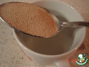 ДДрожжи развести в 100 гр воды с десертной ложкой сахара, дать подняться (это минут 5)