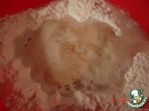 Из муки сделать ямку, вылить оставшуюся воду, положить соль и дрожжи, которые уже подошли