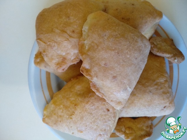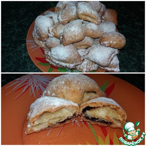 Каждый кусочек раскатать, вырезать кофейным блюдечком кружочек, разделить его мысленно на 4 части и на один из секторов насыпать ложечку начинки. Свернуть вчетверо, тщательно защипать.