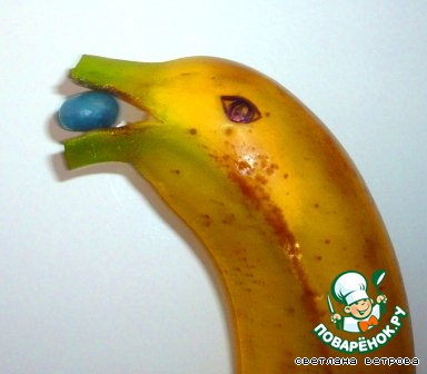 Берем банан, хвостик надрезаем, рисуем гелевой ручкой глазки - дельфинчик готов!