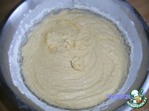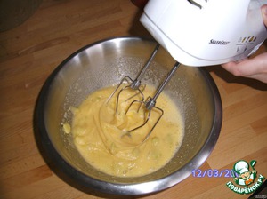 Хорошо размешиваем масло с сахаром, ванильным сахором, солью, раскрошеным марципаном и яйцами.