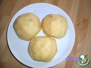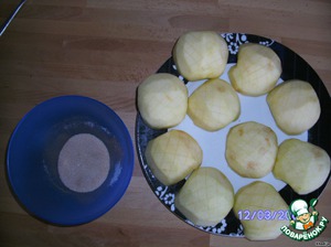 Чистим яблоки и делаем по яблоку крупные нарезы. Смешиваем сахар с корицей.