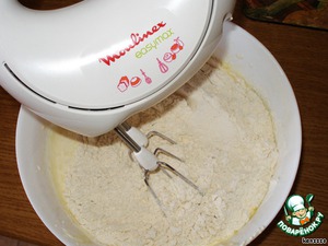 Добавляем муку такой же стакан (просеивать не надо) и хорошо вымешиваем миксером. Тесто получается жидким, примерно, как на шарлотку. (Кстати, миксер Мулинекс выиграла в конкурсе на Поваренке). Тесто готово, можно его отставить в сторону. займемся начинкой.