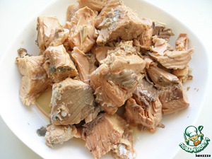 Вскрываем 3 банки горбуши натуральной (я брала фирмы "Донской орешек", на мой взгляд самая вкусная). Жидкость сливаем.