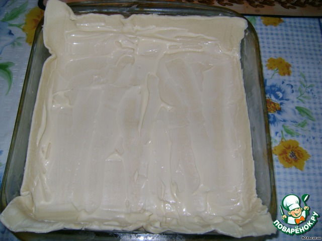 Тесто размораживаем, делим на две части, одну немножко раскатываем и кладем в форму, смазанную маслом. Сверху смазываем майонезом