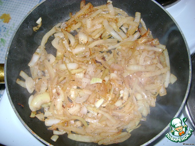 Потом выкладываем пожаренный лук, филе, порубленные яйца, поливаем еще немножко майонезом и закрываем второй частью теста и защипываем края. Смазываем сырым яичком и присыпаем кунжутными семечками.