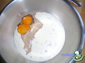 В чашке размешиваем муку и разрыхлитель, добавляем желтки, сливки, сметану и соль. Перемешиваем и оставляем на 2 часа при комнатной температуре. Белки ставим в холодильник.
