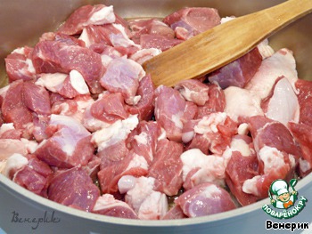 Мясо порезать кусочками, примерно, 3x3 см. -