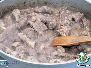 На разогретом растительном масле обжарить мясо, нарезанное кусочками. Обжаривать 10-15 минут. Посолить, поперчить.