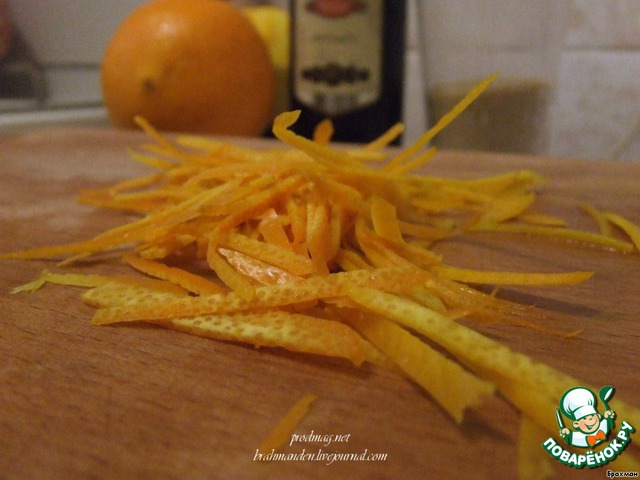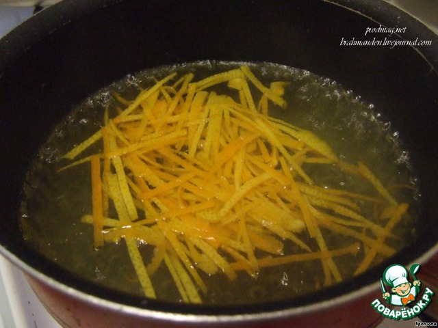 - Цедру, что резали полосками, проварим пару минут в небольшом количестве воды и откинем на дуршлаг.