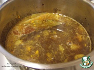 Вливаем апельсиновый сок, добавляем лавровый лист. Готовим на среднем огне 5 минут. Лавровый лист вынимаем.