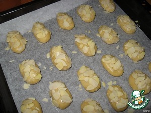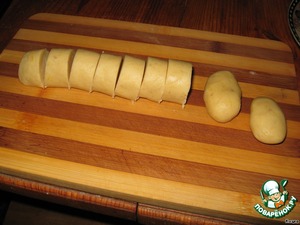 Формируем колбаску, делим её на кусочки и катаем печеньки размером, примерно, с грецкий орех (у меня получилось 25 печенюшек – точно, как указано в рецепте, но можно делать их и помельче). Каждый шарик макаем в слегка взбитый белок и укладываем на застеленный пергаментом противень.