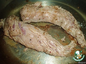 Через пару часов присаливаем и бросаем мясо по нескольку кусков (не всё сразу) вместе с остатками маринада на раскалённую сковородку. Обжариваем 1 минуту, переворачивая. Если вырезка крупнее, чем у меня, режем поперёк на 2 или 3 части.