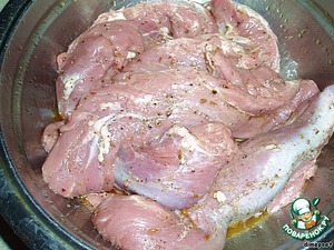 Берём вырезку помоложе. Маринуем в смеси перцев, орегано, оливковом масле. Растираем между ладонями щепотку зиры. НЕ СОЛИМ!!! -