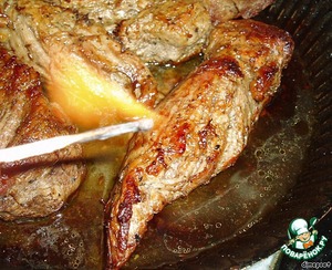 Ещё через 7 минут вынимаем. Выливаем на мясо коньяк и фламбируем.