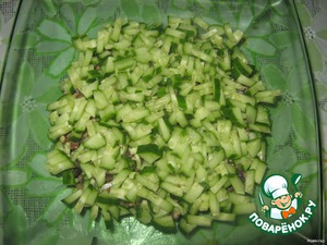 Печень мелко нарезать. Выкладываем в салатник первым слоем.