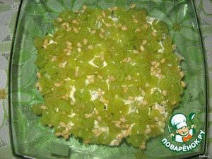 Виноград нарезать, выложить четвёртым слоем, посыпать орешками.